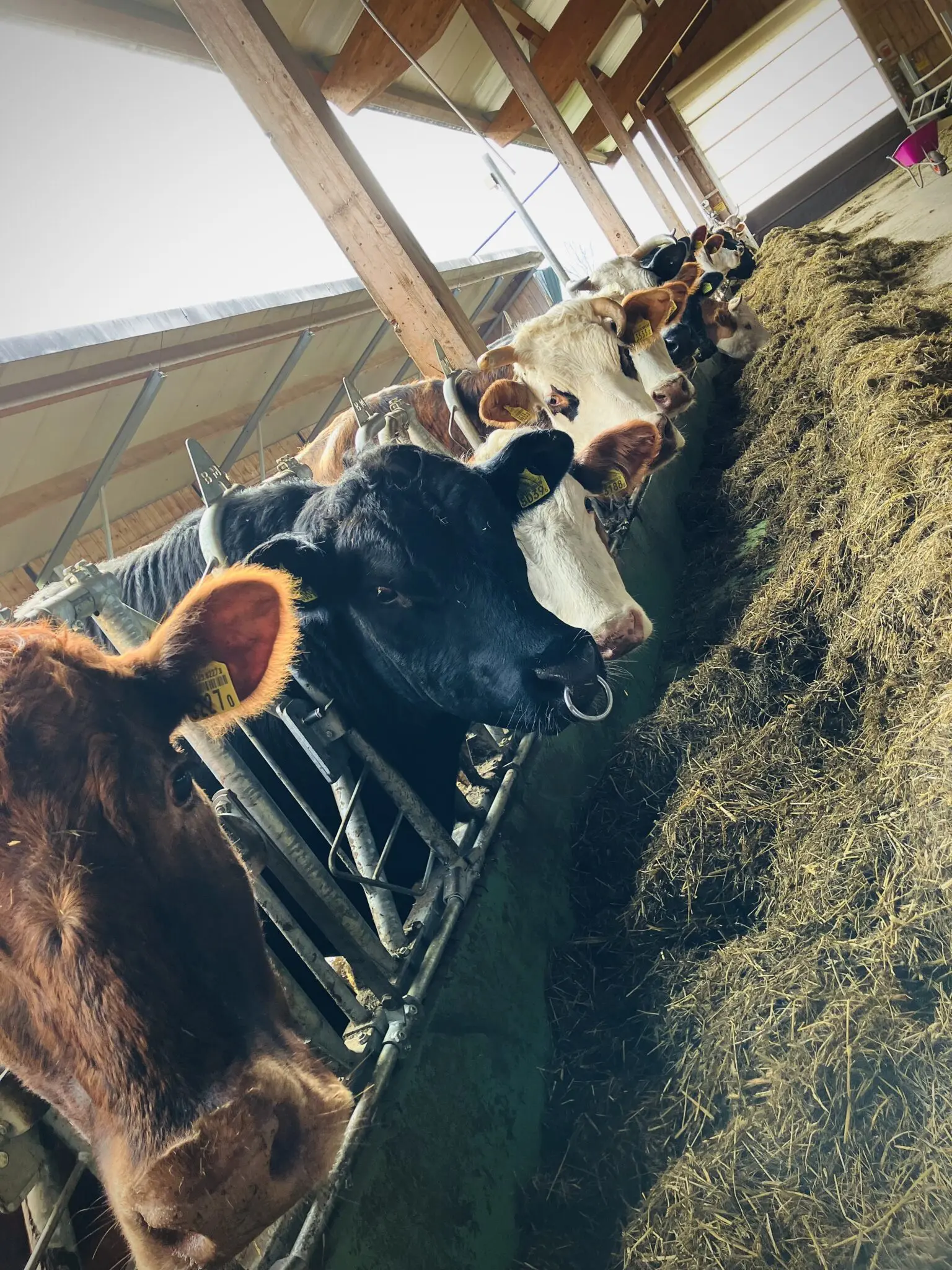 Unsere Mutterkühe, Rinder & Kälber leben im hellen, offenen Laufstall, wo sie sich nach Lust & Laune an der frischen Luft bewegen oder unter Dach auf den Strohmatratzen faulenzen & wiederkäuen können.
